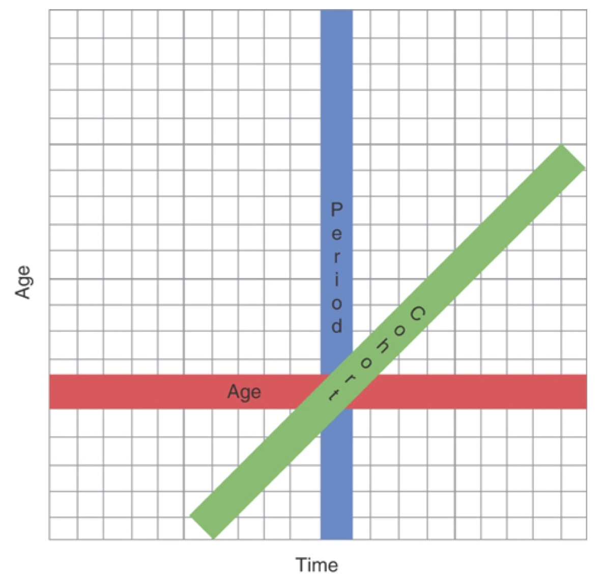 기간, 연령, 코호트는 상호 연관되어 있습니다. 이들의 관계는 위 그림과 같은 렉시스 다이어그램으로 설명할 수 있습니다. 인구통계학에서 Lexis 다이어그램은, 코호트에 속한 개인에게 발생하는 사건 (출생 또는 사망 등)을 나타내는 데 사용되는 2차원 다이어그램입니다.