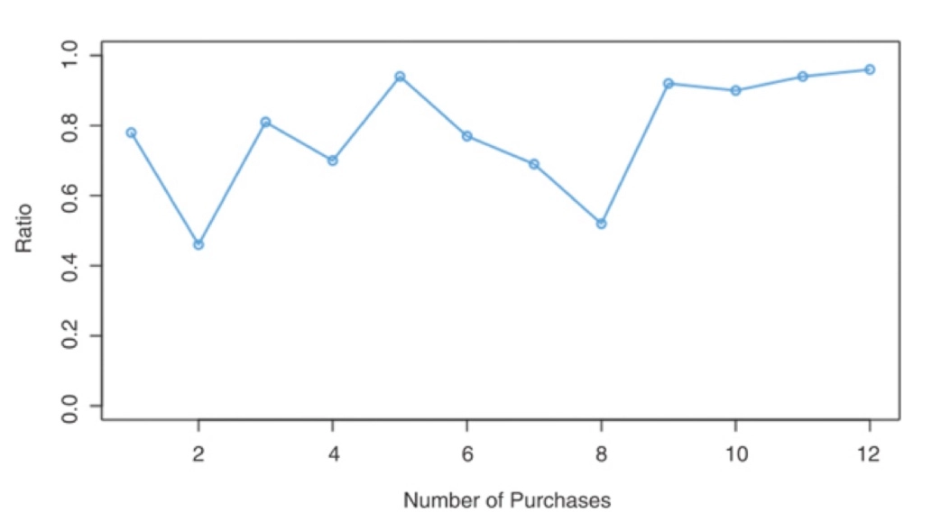 이렇게 계산하면, 각 구매 횟수에 따라 비율이 어떻게 변하는지 확인할 수 있습니다. 구매 횟수가 증가하면서 진행 비율도 증가하는 것을 알 수 있습니다. 일반적으로 구매 횟수가 늘어날수록 구매가 더 끈끈해지기 때문입니다. 이를 Line plot으로 시각화하면, 언제 구매에서 막히는지(stopgap) 확인할 수도 있습니다.