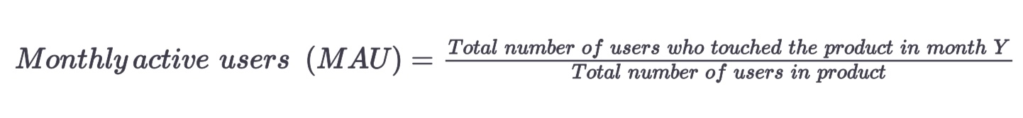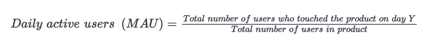 MAU(월간 활성 사용자)와 DAU(일일 활성 사용자)는 가장 일반적인 인게이지먼트 지표입니다. MAU는 일반적으로, 지난 달 서비스를 사용한 모든 사용자 수를 제품의 모든 (활성)사용자로 나눈 값입니다.